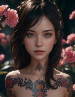 (,1girl, ,best quality, ),looking at viewer,  ,,ultra detailed background,ultra detailed background,ultra realistic 8k cg,, ,masterpiece, (( , )),ultra realistic 8k cgSurrounded by strange, movie perspective, advertising style, Colorful background, splash of color A beautiful woman with delicate facial features,tattoo all over body, flower arms,from above,