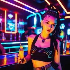 Bar photo,best picture quality,masterpiece,<lora:barphoto_XL:0.6>,- Features: The girl is dressed in cyberpunk style clothing,wearing futuristic accessories such as glowing earrings or necklaces,holding a smartphone with a high-tech appearance,with a confident and curious expression.,- Atmosphere: The lighting inside the bar is neon-colored,with interwoven light and shadow,creating a strong sense of the future and technology,with a touch of mystery.,- Style: The style of the picture is distinct,combining the typical elements of cyberpunk,such as metal texture,cold light colors,and digital screens,the girl's actions and expressions complement the environment.,- Background: The interior of the cyberpunk bar,with decorations full of a sense of technology,such as LED screens,fiber optic lights,and holographic projections,as well as furniture designs full of futurism.,- Lighting: Use cold light colors and neon light effects to emphasize the cyberpunk characteristics of the bar,while highlighting the girl's silhouette and expression through light and shadow effects.,
