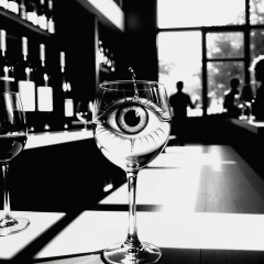 bar photo,<lora:barphoto_XL:0.6>,(through the glass to see the 1 eyeball:1.5),as well as a hint of mystery and anticipation.,using exaggerated techniques to express the relationship between the eyes and the wine glass.,creating a contrast between light and shadow to enhance the visual effect.,abstract school,sketch style eyeball,stream of consciousness,black and white tones,