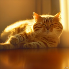 Create a serene image of a cat lounging in a sunlit room. The cat is positioned lazily on an old wooden floor, its fur glistening with the golden light filtering through a nearby window. The composition focuses on the cat's relaxed pose, with its eyes half-closed and a contented expression. The lighting is soft and warm, enhancing the cozy atmosphere of the scene.