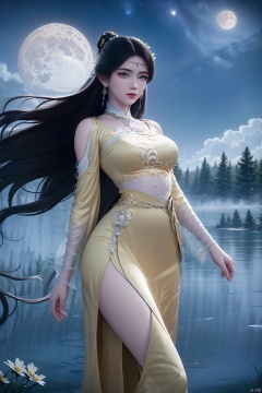 1girl, solo, long hair, looking at viewer, blue eyes, black hair, hair ornament, dress, jewelry, flower, earrings, outdoors, sky, water, hair bun, tree, clothing cutout, night, facial mark, moon, grass, night sky, full moon, shoulder cutout, yellow dress
