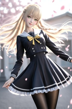 (masterpiece),(best quality),illustration,ultra detailed,hdr,Depth of field,(colorful),1girl, solo, long hair, pantyhose, green eyes, looking at viewer, blonde hair, very long hair, long sleeves, black pantyhose, blush, sailor collar, dress, frills, hair between eyes, petals, smile, ribbon, closed mouth, head tilt, blurry, school uniform, frilled dress, floating hair, cowboy shot, standing, neck ribbon, braid, puffy sleeves, bow, yellow ribbon