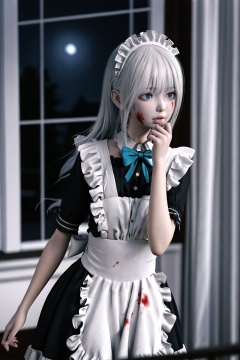 (masterpiece),(best quality),illustration,ultra detailed,hdr,Depth of field,(colorful),realistic,loli,Amazing,highres,intricate detail,best illumination,best shadow,(late at night),night,(Dark blue theme),Depth of field,window,White curtains,1girl,loli,solo,bangs,blood on face,dark persona,white hair,Blue bow tie,maid,Short sleeve,apron,maid headdress,long hair,hand on own chin,teary-eyed,blood on clothes,blood,maid apron,
