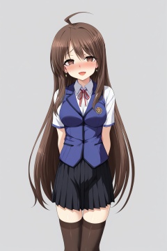 (((masterpiece))),((best quality)),1girl,long hair,thighhighs,brown hair,solo,brown eyes,blush,skirt,school uniform,zettai ryouiki,open mouth,smile,earrings,looking at viewer,breasts,arms behind back,jewelry,medium breasts,black thighhighs,white background,very long hair,simple background,<lora:Quan_XL:0.2>,<lora:add-detail-xl:1>,incredibly absurdres,<lora:wy2-000010:1>,looking_at_viewer,<lora:flat_sdxl:1>,ahegao,
