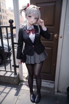 ,masterpiece,best quality,1girl,solo,gothic style,full body,makeup,beautiful_detailed_eyes,braided ponytail,streaked hair,fang_out,nail_polish,blazer,school uniform,plaid_skirt,leggings,black_loafers,bracelet,hairband,cat_on_head,
