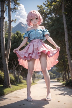 1girl,looking at viewer,solo,blonde hair,pink hair,short hair,multicolored hair,two-tone hair,hair between eyes,green eyes,blush,shirt,blue shirt,striped shirt,collarbone,off-shoulder shirt,short sleeves,skirt,pink skirt,frills,layered skirt,frilled skirt,sandals,(happy,wariza,cowboy_shot,from_below:1.1),beautiful face,beautiful eyes,glossy skin,shiny skin,Glacier,Peaks,Mountains,Ice,Blue,Crevasse,Serenity,Wilderness,Bonsai trees,Moss,Gravel pathways,Raked sand,Tranquility,Meditation,beautiful detailed sky,beautiful detailed glow,posing in front of a colorful and dynamic background,masterpiece,best quality,beautiful and aesthetic,contrapposto,female focus,wallpaper,fashion,