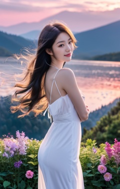 1girl,xuejie,best quality,masterpiece,realistic,cowboy_shot,(Good structure),DSLR Quality,Depth of field,kind smile,looking_at_viewer,Dynamic pose,(HD),(Super Resolution),(4K),(Fidelity),(Pro Photography),(dslr quality),(DSLR detail),(sharpness),(masterpiece),(Epic Photography),1 Girl,black hair,blue butterfly,pretty butterfly,shiny butterfly,bracelet,chest,bug,butterfly,cloud,Cloudy Sky,Pink Sky,pretty dress,white tulle dress,flowers,big Full Moon,jewelry,Long Hair,moon,Moonlight,Mountain,Mountain Horizon,night sky,outdoor,planet,Pink Sky,Sky,alone,lying,stars (Sky),gorgeous sky,very long hair,(so many flowers),liruotong,<lora:xingganchengshuxuejie:0.8>,