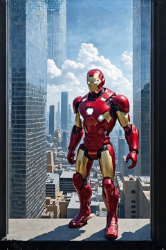 backdrop:futuristic city skyscrapers,sky,cloud,cluttered maximalism,ironman focus