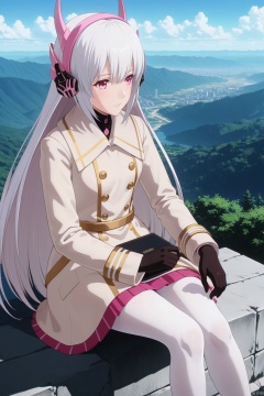 masterpiece,bestquality,anime screencap,wallpaper,high contrast,depth of field,1girl,long hair,solo,white hair,pink eyes,outdoors,blue sky,white coat,headgear, aniamte_color,skirt,white pantyhose,sitting,feet,from above