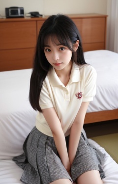 1girl,keai,cute little girl,(medium breasts:1.2),long black hair,first love girlfriend,Japanese style photo,Japanese high school student,wearing school uniform,rabbit sitting,on a white bed,attractive,attractive eyes,want to have sex,looking at the camera,boyfriend perspective,big eyes,delicate features,fair skin,<lora:rixikeaishaonv:0.4>,