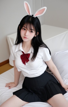 1girl,(medium breasts:1.2),long black hair,first love girlfriend,Japanese style photo,Japanese high school student,wearing school uniform,rabbit sitting,on a white bed,attractive,attractive eyes,want to have sex,looking at the camera,boyfriend perspective,big eyes,delicate features,fair skin,<lora:rixikeaishaonv:0.4>,