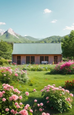 zhantai,high definition,normal contrast,e-commerce booth,wooden booth,big plant leaves,high-end color,slightly dim light,plants and flowers surround the stand,in a meadow,pink and red flowers,natural scenery,mountain,mountain,green plant,flowers,light blue sky,<lora:dianshangzhantai:0.7>,