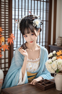 Realism, best quality, 1girl, flower, hanfu, solo, hair ornament, chinese clothes, leaf, black hair, looking at viewer, red lips, off shoulder, indoors, hair flower, white flower, maple leaf, bare shoulders, long sleeves, dress, hand up, blue eyes, long hair, comb, head tilt, wide sleeves, shawl, sash, closed mouth, box, collarbone, blunt bangs, hair stick, autumn leaves, updo, makeup, vase, hair bun, brown hair, table, realistic, blurry, smile, lipstick, upper body