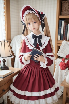 masterpiece,Realism,best quality,loli,1girl,blonde hair,shinku,dress,book,blue eyes,solo,bonnet,bow,holding,flower,lamp,rose,looking at viewer,long hair,red dress,black bow,frills,bowtie,realistic,long sleeves,indoors,frilled dress,cup,lips,lolita fashion,red headwear,capelet,lace trim,twintails,holding book,black bowtie,teacup,open book,lace,red flower,picture frame,standing,closed mouth,hat,painting (object),red rose,lace-trimmed sleeves,blunt bangs,nose,ribbon,head tilt,desk lamp,