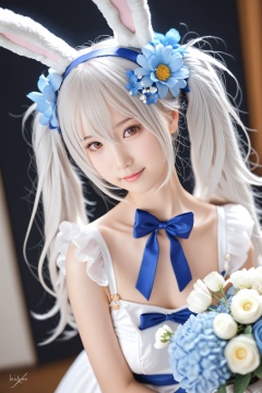 masterpiece,Realism,best quality,loli,1girl,animal ears,solo,flower,gloves,rabbit ears,white gloves,white hair,hair ornament,dress,looking at viewer,hair flower,white dress,twintails,blurry background,blurry,hair between eyes,bow,upper body,white flower,fake animal ears,brown eyes,official alternate costume,lips,blue flower,blue bow,bowtie,ribbon,dutch angle,long hair,breasts,blue bowtie,closed mouth,laffey (azur lane),realistic,smile,signature,blue ribbon,bouquet,head tilt,artist name,