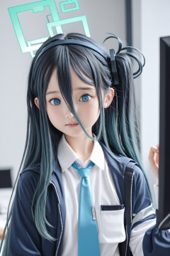 masterpiece, best quality, realistic,loli,1girl, aris (blue archive), blue eyes, solo, long hair, necktie, jacket, hair between eyes, shirt, blue necktie, black hair, white shirt, collared shirt, halo, upper body, long sleeves, open clothes, blurry, very long hair, long bangs, open jacket, one side up, blue hair, dark blue hair, blurry background, ringed eyes, hairband, indoors, school uniform, hand up, closed mouth, monitor