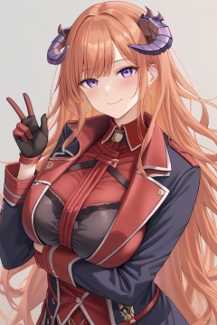 1girl, solo, long hair, breasts, looking at viewer, blush, smile, bangs, large breasts, shirt, gloves, long sleeves, jewelry, very long hair, closed mouth, purple eyes, jacket, earrings, open clothes, horns, black gloves, hand up, orange hair, black jacket, red shirt, red gloves, dragon horns, arm under breasts