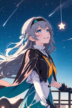1girl, solo, long hair, smile, bangs, blue eyes, gloves, holding, hairband, sky, cape, book, headband, looking up, star \(sky\), starry sky