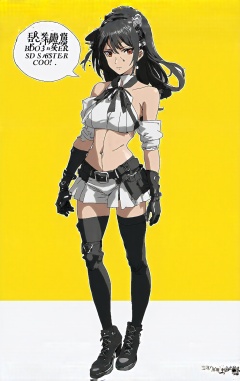 A futuristic anime illustration of Cassin from Azur Lane. A solo 1-girl scene featuring a stunning heroine with long black hair adorned with a hair ornament and sporting striking red-orange heterochromatic eyes. She stands confidently, showcasing her full-body proportions, including bare shoulders, black thigh-highs, fingerless gloves, and off-shoulder attire. Delicate jewelry adorns her neck and ears. Her mole under one eye adds a touch of whimsy to her features. The background is simple yet cluttered with machinery and turret elements, while the heroine's asymmetrical legwear and single knee-high create an intriguing visual balance. (yellow backdrop), (big word bubble on top with big fonts saying "EK Anime Booster SD3 is so cool~":1.3),(cowboy shot:1.3), (ink art style,water color:1.8),(ink splashes:1.3),sketch