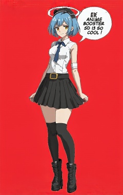 Gascogne \(Azur Lane\),1girl, solo, breasts, looking at viewer, short hair, bangs, skirt, shirt, thighhighs, bare shoulders, medium breasts, blue hair, standing, full body, yellow eyes, white shirt, multicolored hair, pleated skirt, boots, sleeveless, belt, black thighhighs, black skirt, black footwear, streaked hair, headgear, cross, machinery, turret, cannon, armored boots, rigging, mechanical halo,red background, (word bubble with big fonf saying "EK Anime Booster SD3 is so cool.":1.4),close-up:1.3, (cartoon style,anime style:1.8),(by Hayao Miyazaki$ and Osamu Tezuka$),best quality