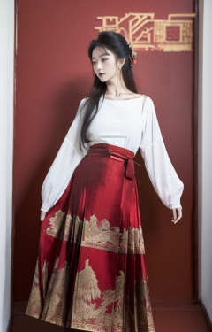 (8k, RAW photo, best quality, masterpiece:1.2),(mamianqun:1.2),1girl,solo,medium breasts,narrow_waist,(traditional white top:1.4),wearing a dark blue long dress,(red wall:1.4),long hair,chinese style clothes,dancing posture,photo posture,chinese wind photos,standard pretty girl,traditional hairstyle,<lora:mamianqun:0.7>,