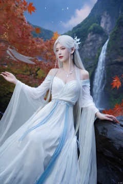 (masterpiece,best quality),1girl, solo, long hair, (big breasts:1.29), looking at viewer, dress, bare shoulders, jewelry, white hair, earrings, detached sleeves, wings, necklace, white dress, lips, tiara,Xtianhuxiaobai,Maple leaves, flowers,waterfalls, volcanoes,