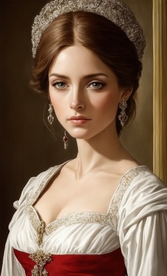 A close-up portrait of a medieval princess. She exudes nobility and elegance, adorned in attire and accessories typical of the medieval era, featuring ornate and sophisticated designs. Her face carries a serene and restrained expression, with deep and thoughtful eyes. Soft lighting gently highlights her features, while the background captures a royal ambiance.
