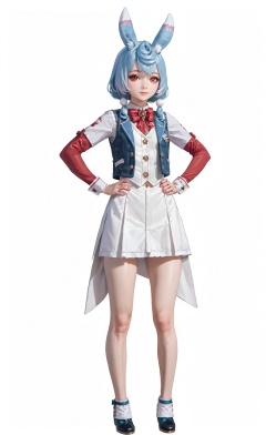 score_9, score_8_up, score_7_up, 8k, best quality, masterpiece, (ultra-detailed), (high detailed skin), (white background:1.6), (full body:1.2), (white background), standing, looking at viewer, (solo:1.2), hands on hips, realistic, <lora:Sigewinne-pony-Tanger-000012:0.6>, Sigewinne, 1girl, red eyes, animal ears, rabbit ears, virtual youtuber, (miniskirt, mini vest:1.4), blue hair, (beautiful_face), ((intricate_detail)), clear face, ((finely_detailed)), fine_fabric_emphasis, ((glossy)), full_shot,
