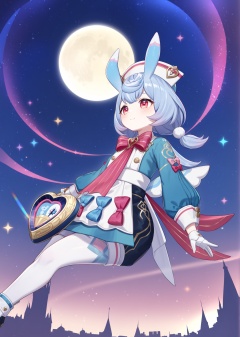 8k, best quality, masterpiece, (ultra-detailed), (high detailed skin), <lora:Sigewinne-A3-Tanger-000012:0.8>, Sigewinne, Sigewinne's def clothes, 1girl, red eyes, gloves, animal ears, rabbit ears, hat, white gloves, long sleeves, <lora:jijiav2-a3-Tanger-000005:0.8>, jjijia, 2d, anime, A magical girl flying through a night sky, with a full moon and twinkling stars above. Below her, a fantasy city with towering spires and glowing runes. Magic trails follow her flight, illuminating the sky with shimmering light. High contrast, vivid colors, dynamic pose, whimsical style, starry effects, ethereal glow, hd quality, natural look --ar 16:9 --v 6.0