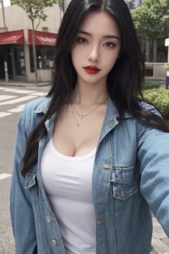 1girl, black hair, breasts, cleavage, jacket, jewelry, large breasts, letterboxed, lips, lipstick, long hair, looking at viewer, makeup, mole, necklace, outdoors, realistic, red lips, selfie, shirt, solo, upper body