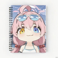 chibi, 1girl, hoshino \(blue archive\), heterochromia, solo, eyewear on head, hoshino \(swimsuit\) \(blue archive\), pink hair, sunglasses, blue eyes, looking at viewer, ahoge, hair ornament, yellow eyes, smile, hair bobbles, halo, hair between eyes, low twintails, portrait, :3, twintails, tinted eyewear, official alternate costume, closed mouth, long hair, blue-tinted eyewear, white-framed eyewear,notebook cover, content on the cover