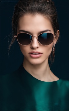 Kristen Stewart,a young beautiful girl,20yo,detailed exquisite face,soft shiny skin,perfect female form,looking at viewer, Fashion model,parody,hourglass figure,sexy pose, Wearing sunglasses, ., Vibrant colors,Rose Gold,Deep Navy and Mint Green colors, (dark), (close up upperbody shot:1.3),(dark:1.2)