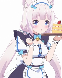 Nekopara,NK_TV_Style, Vanilla_\(nekopara\), 1girl, solo, cake, animal_ears, food, blue_eyes, long_hair, bow, breasts, blue_bow, cat_ears, bell, twintails, maid_headdress, short_sleeves, apron, white_hair, cleavage, simple_background, looking_at_viewer, white_background, blunt_bangs, maid, holding, bowtie, blush, puffy_short_sleeves, low_twintails, jingle_bell, name_tag, puffy_sleeves, blue_bowtie, very_long_hair, cake_slice, waist_apron, holding_tray, animal_ear_fluff, ribbon_trim, tray, frills, hand_up, medium_breasts, holding_plate, cleavage_cutout, clothing_cutout, plate, waitress, white_apron, hair_bow, :o, parted_lips, ribbon, cat_girl, dress, fruit, strawberry, neck_bell, frilled_apron, wrist_cuffs, open_mouth,