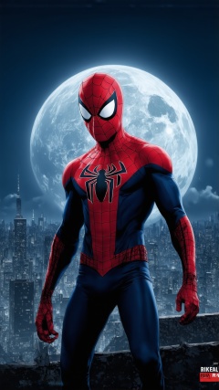 A close-up of Spider-Man in a stealthy pose on a rooftop under a full moon. His suit blends with the shadows, and his eyes are alert. The background features the moonlit cityscape with a few clouds drifting by, adding to the mysterious atmosphere.dark:1.2