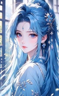 masterpiece,8k,best quality,1girl,solo,kawaii,hanfu,,ancient customs,long hair,indoors,parted bangs,light blue hair,(depth of field),close-up,,gem,pout,updo,chinese clothes