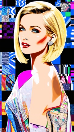Pop art of patchwork style for a beautiful blonde model,ow key,short hair,detailed exquisite face,elegant dress,parody,mysterious and ethereal,unearthly,