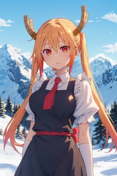 <lora:Tooru-000009:0.8>,Tooru CYQL,1girl,looking at viewer,solo,dragon girl,blonde hair,long hair,twintails,multicolored hair,gradient hair,hair between eyes,dragon horns,slit pupils,red eyes,breasts,large breasts,dragon tail,large tail,necktie,maid,shirt,short sleeves,gloves,dress,white gloves,white shirt,puffy sleeves,puffy short sleeves,elbow gloves,collared shirt,frills,expressionless,upper_body,Majestic snow-capped mountains pierce the clouds, their snow-covered peaks shimmering in the sunlight. At their base, glaciers inch forward, carving out profound valleys,beautiful detailed sky,beautiful detailed glow,posing in front of a colorful and dynamic background,masterpiece,best quality,beautiful and aesthetic,contrapposto,female focus,wallpaper,