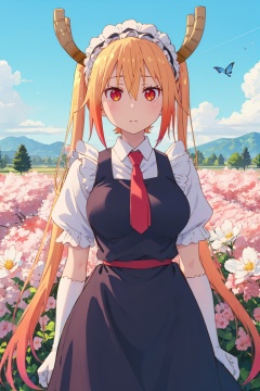 <lora:Tooru-000009:0.8>,Tooru CYQL,1girl,looking at viewer,solo,dragon girl,blonde hair,long hair,twintails,multicolored hair,gradient hair,hair between eyes,dragon horns,slit pupils,red eyes,breasts,large breasts,dragon tail,large tail,necktie,maid,shirt,short sleeves,gloves,dress,white gloves,white shirt,puffy sleeves,puffy short sleeves,elbow gloves,collared shirt,frills,naughty_face,cowboy_shot,Late spring into early summer, hillsides burst with a profusion of blooming flowers, a kaleidoscope of colors, bustling with bees and butterflies,beautiful detailed sky,beautiful detailed glow,posing in front of a colorful and dynamic background,masterpiece,best quality,beautiful and aesthetic,contrapposto,female focus,wallpaper,
