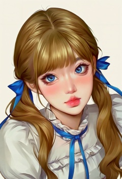 (画风22:1),upper body, oblique light, oval face, ears, exquisite nose, black long eyelashes, blunt bangs, 1girl, blonde hair, blue eyes, long hair, blue hair ribbon, closed mouth, white dress, pink lips, hair bow, puffy sleeves, wavy hair, realistic style, twintails, blush, frills, simple background, from above, digital illustration