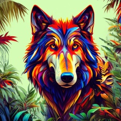 AAsp3ctr4m0rph1qu3 style abstract wolf, vibrant, high-resolution colours, two-tone colour rainforest background, humid atmosphere