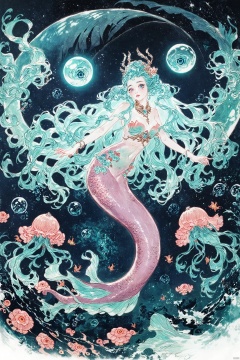 Eyes as deep as the starry sky,Mermaid, long flowing hair, love, best quality,Amazing,finely detail,Depth of field,extremely detailed CG unity 8k wallpaper,Deep sea background,jellyfish,masterpiece,fluttered detailed splashs, beautiful detailed water,cosmic eyes,Shock sensation,(realistic :0.5),octopus,original,