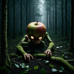In a dark, foggy forest, a hyperrealistic photography captures an eerie and horror-filled scene: a twisted, apple-like monster creature sprawls across the forest floor, its core now home to claw-like branches that grasp at the air. (((Shiny eyes))) glimmer with an otherworldly intensity, while (((sharp teeth))) seem ready to strike. The fallen leaves and moss-covered ground create an atmosphere of foreboding, dark, eerie as the low-angle shot places the viewer in a position of vulnerability alongside this unsettling, anthropomorphic being.