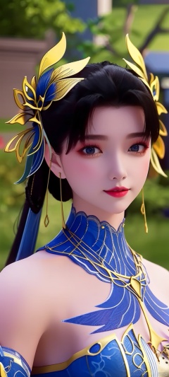 3D,masterpiece,(best quality),(makeup),official art, extremely detailed cg 8k wallpaper,((crystalstexture skin)), (extremely delicate and beautiful),(highly detailed),qinger, 1girl, dress, blue dress, solo, hair ornament, jewelry, smile, black hair, looking at viewer, bare shoulders