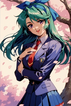 score_9,score_8_up,score_7_up,score_6_up, retro artstyle, 1980s (style),1girl,solo,long hair,skirt,hairband,school uniform,open mouth,purple eyes,necktie,pleated skirt,petals,blazer,jacket,blue skirt,hair bow,bow,long sleeves,smile,blue hair,green hair,hand on own chest,tree,looking at viewer