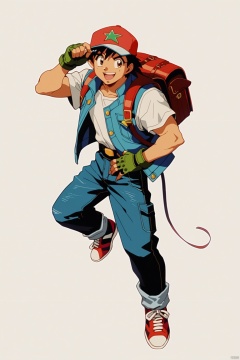 score_9,score_8_up,score_7_up,score_6_up, retro artstyle, 1980s (style),solo, 1boy, hat, male focus, gloves, baseball cap, ash ketchum, fingerless gloves, shoes, backpack, black hair, simple background, bag, open clothes, open mouth, white background, sneakers, full body, pants, jacket, open jacket, smile, jeans, :d, green gloves, denim, short sleeves
