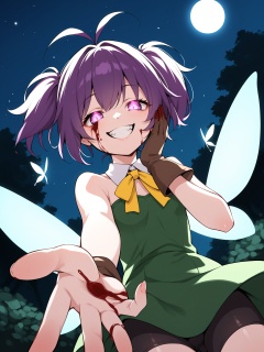 1girl, solo, short hair, purple hair, antenna hair, twintails, single sidelock, yellow ribbon, purple eyes, detached collar, green dress, frills, bare shoulders, bike shorts, fairy wings, brown gloves, upper body, hand on face, blood, blood on face, blood on hands, evil smile, teeth, yandere, horror \(theme\), glowing eyes, garden, night sky, fang, heavy breathing, half-closed eyes, pointing at viewer, from below , score_9, score_8_up, score_7_up, score_6_up, score_5_up, score_4_up, BREAK source_anime, masterpiece