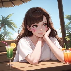 score_9, score_8_up, focus on face, D.va(Overwatch), looking away, resting on the table, adjusting hair, melancholic, white t-shirt, cocktail, palm trees in the background,