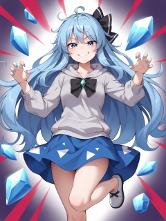 best quality, masterpiece, score_9, score_8_up, ink style,1girl, yorigami shion, touhou, blue hair, blue eyes, blue skirt, grey shirt, ofuda on clothes, very long hair, messy hair, posing, bow, grey hoodie, looking at viewer, smug face, claw pose, (dynamic:1.3), motion blur, full body,abstract background, blurry foreground, ofuda, gems, crystals