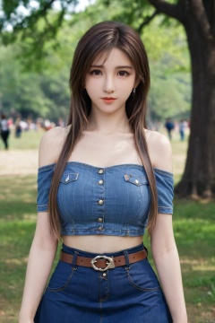 1girl, 3d, bare_shoulders, belt, blurry, blurry_background, blurry_foreground, branch, breasts, brown_eyes, brown_hair, collarbone, cosplay_photo, denim, denim_skirt, depth_of_field, hand_on_own_chest, lips, long_hair, looking_at_viewer, midriff, miniskirt, motion_blur, navel, outdoors, photo_\(medium\), realistic, skirt, solo, standing, tree,Xtifa,,(big breasts:1.79),