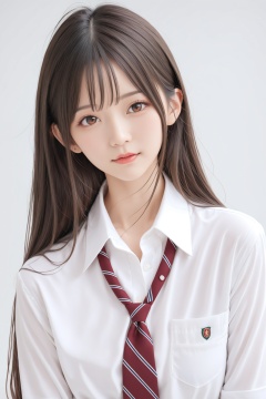 (masterpiece),(best quality),solo, 1girl, necktie, shirt, looking at viewer, long hair, white shirt, simple background, collared shirt, brown eyes, brown hair, head tilt, upper body, closed mouth, red necktie, lips, school uniform, wing collar,